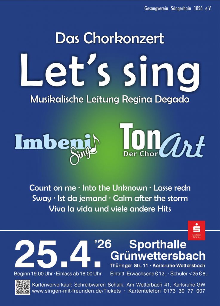 „Let’s sing“ heißt die gutgelaunte Aufforderung der Chöre Tonart und Imbeni, die am 25. April um 19 Uhr ein Konzert in der Sporthalle Grünwettersbach geben. Unter der Leitung der Vollblut-Musikerin Regina Degado stehen aktuelle Hits ebenso wie bekannte Chartbreaker aus den vergangenen 20 Jahren auf dem Programm. Highlight wird sicherlich der gemeinsame Auftritt beider Chöre auf der Bühne sein – dann werden an die achtzig Sänger den Saal stimmgewaltig mit Musik erfüllen.